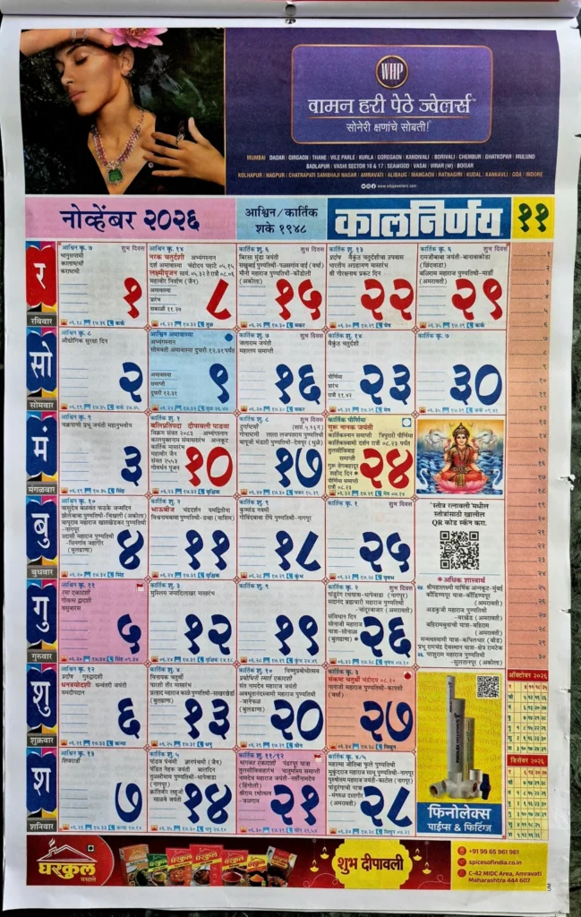 नोव्हेंबर कालनिर्णय दिनदर्शिका ही महत्त्वाच्या तारखा, सण, आणि रोजचे पंचांग यासाठी एक विश्वसनीय मार्गदर्शक आहे. भारतभरातील लाखो लोक ही दिनदर्शिका वापरतात, कारण ती धार्मिक कार्यांपासून कौटुंबिक नियोजनापर्यंत प्रत्येक गोष्टीसाठी उपयोगी ठरते.